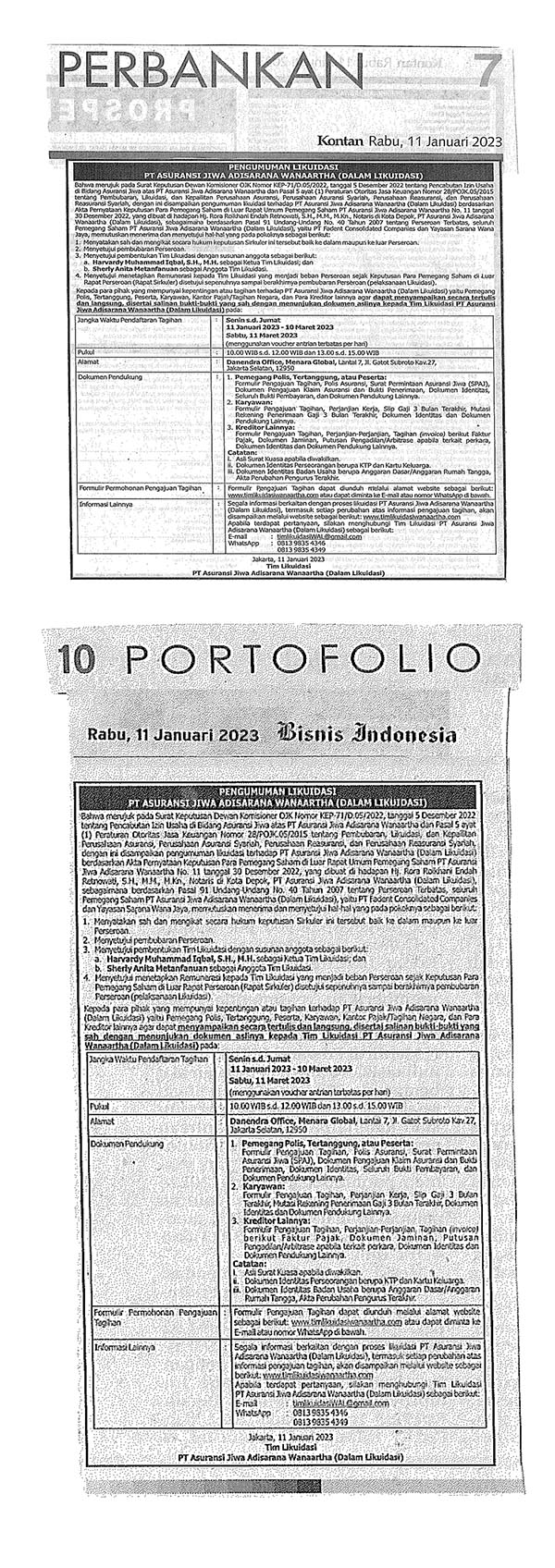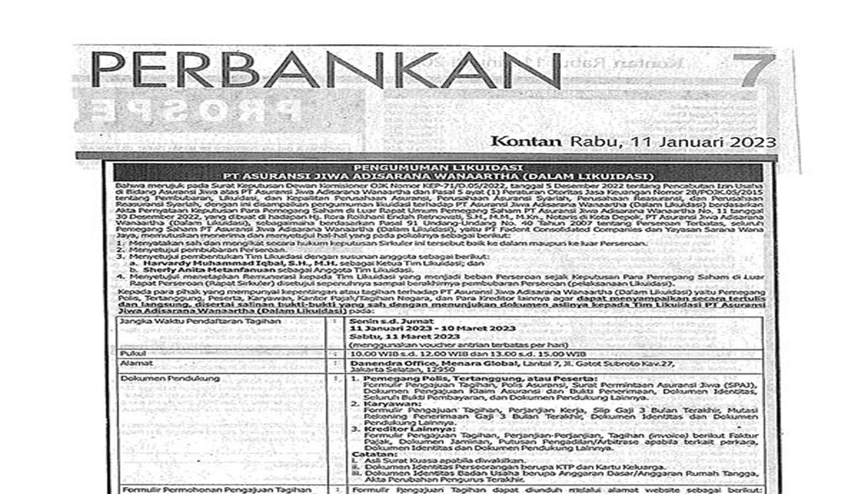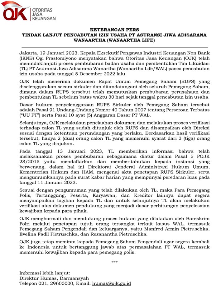 Otoritas Jasa Keuangan (OJK) telah mencabut izin usaha PT Asuransi Jiwa Adisarana Wanaartha (Dalam Likuidasi) berdasarkan Surat Keputusan Dewan Komisioner OJK No. KEP-71/D.05/2022 tanggal 5 Desember 2022. Selanjutnya, telah dibentuk Tim Likuidasi PT ....